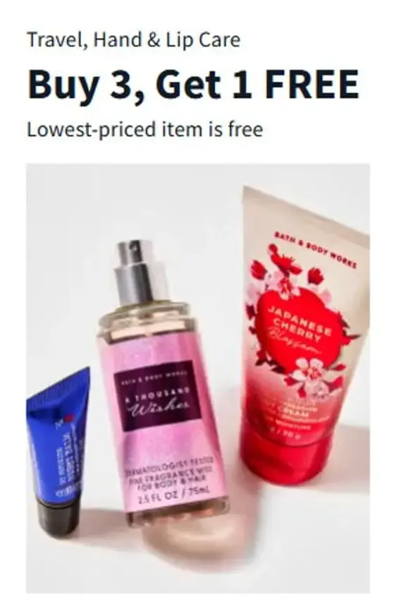 Hurry & save! Shop in store and get travel, hand & lip care for buy 3, get 1 free.